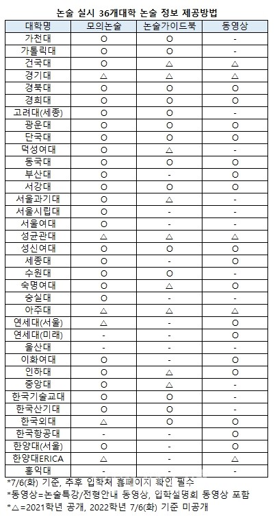 7월6일 기준, 3개 모두 공개 7개 대학.. 모의논술 일정, 특강 등 공개내용 확인