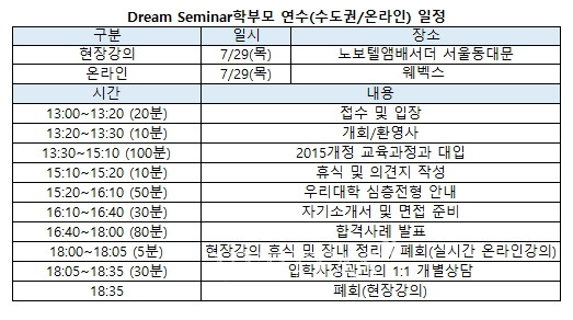 [베리타스알파=김하연 기자] 동국대는 2021년 Dream Seminar 수도권/온라인 학부모연수 프로그램 진행 일정을 최근 밝혔다. Dream Seminar는 고교생 자녀를 둔 학부모들을 대상으로 자녀의 대입 준비에 실질적인 도움을 주고자 대입에 필요한 정보를 제공하는 프로그램이다. 프로그램은 현장강의와 실시간 온라인강의로 나뉜다. 현장강의는 7월29일 13:00~18:35 노보텔앰배서더 서울 동대문에서 총100명을, 온라인강의는 7월29일 13:00~18:00 웨벡스 화상회의를 통해 총 150명을 모집한다. 신청 기간은 22일 오전10시부터 선착순 마감시까지다. 현장강의와 온라인 강의 중 택1이고, 중복 신청은 불가하다.