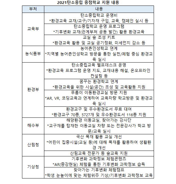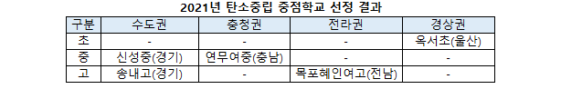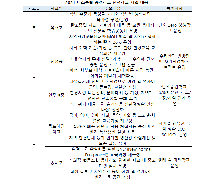 5월 부처합동 공모를 진행한 탄소중립 중점학교 사업은 전국에서 50개 학교가 신청하는 등 많은 관심을 보였다. 선정은 관계부처와 환경교육 전문가로 구성된 심사위원회가 학교가 제출한 계획서, 진단지표 등을 바탕으로 1차 서면심사와 2차 현장실사를 실시해 5개교를 최종 선정했다. 선정 학교들은 학교 여건과 특성에 맞는 탄소중립 프로그램 운영, 학습공동체를 통한 자발적 참여 등에서 우수한 평가를 받았다. 옥서초는 탄소중립과 지속가능발전교육 등에 대한 학교구성원의 이해도와 협력도가 높은 점, 목포혜인여고는 다양한 교과에 환경교육 내용을 반영한 점, 송내고는 지구적 관점에서 행동하는 민주시민 육성을 위한 2NE1교육과정 등이 좋은 평가를 받았다.