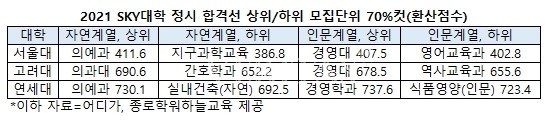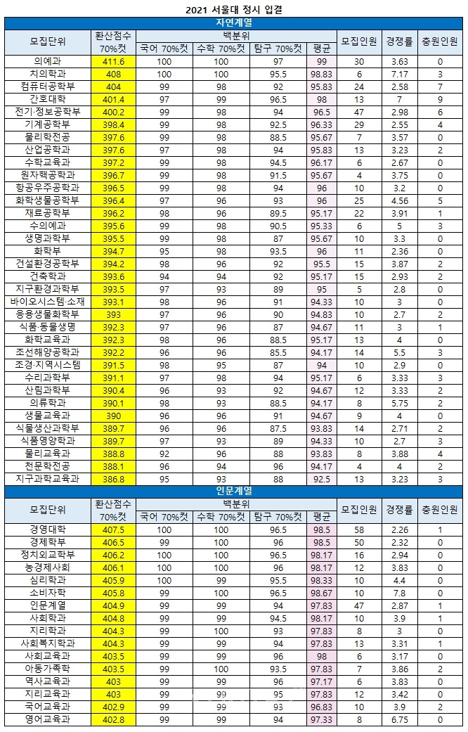 2021정시 합격선(환산점수 기준 70%컷)은 서울대 자연계열에서는 의예과가 411.6점으로 가장 높고, 지구과학교육과가 386.3점으로 가장 낮게 나타났다. 의예과 다음으로는 치의학과408점 컴퓨터공학부404점 간호대학401.4점 전기·정보공학부400.2점 순으로 톱5였다. 인문계열의 경우 경영대학이 407.5점으로 가장 높고, 영어교육과가 402.8점으로 가장 낮았다. 경영대학 다음으로는 경제학부406.5점 정치외교학부406.2점 농경제사회406.1점 심리학과405.9점 순이다.