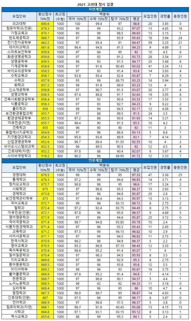 고려대 자연계열에서도 의예과가 대학별 환산점수 70%컷 기준 690.6점으로 가장 높고, 간호학과가 652.2점으로 가장 낮았다. 의예과 다음으로는 컴퓨터학과(인문)678.3점 가정교육과670.1점 반도체공학과668.7점 전기전자공학부662.2점 순으로 톱5다. 인문계열은 경영대학이 678.5점으로 가장 높고, 역사교육과가 655.6점으로 가장 낮게 형성됐다. 경영대학 다음으로 통계학과676.3점 정치외교학과675.7점 사회학과675점 경제학과673.8점 순이다.