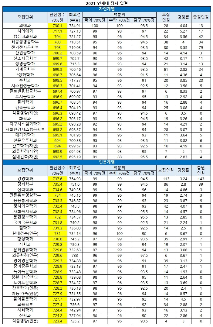 연세대 자연계열 역시 의예과가 730.1점으로 가장 높고, 실내건축학과(자연)가 692.5점으로 가장 낮게 형성됐다. 의예과에 이어 치의예과717.1점 컴퓨터과학과704점 화공생명공학부703점 전기전자공학부703점 순으로 상위5개 모집단위다. 인문계열의 경우 경영학과가 737.6점으로 가장 높았고, 식품영양학과(인문)가 723.4점으로 가장 낮았다. 경영학과 다음으로는 경제학부735.4점 심리학과734.6점 언론홍보영상학부734점 응용통계학과733.3점 순이다.