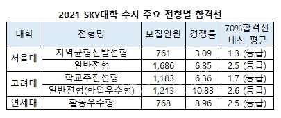 고려대와 연세대의 경우 대표학종 고려대 학교추천의 경우 70%합격선 내신 평균은 1.7등급, 학업우수형은 2.6등급이었다. 연세대 활동우수형의 경우 70% 합격선 내신 평균은 2.5등급으로 나타났다.