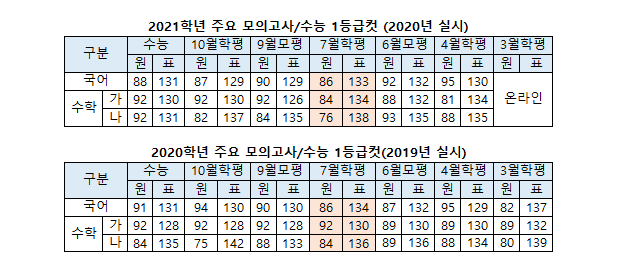 지난 2년간 치러진 7월학평과 수능의 1등급컷을 비교해보면 2021학년의 경우 7월학평의 국어 원점수 등급컷은 86점이었으나 실제 수능은 이보다 높은 88점에서 끊겼다. 수학은 점수차가 더 컸다. 수(가)는 7월학평에서 1등급컷이 84점이었지만, 수능에서는 8점 높은 92점이었다. 수(나)는 7월학평 1등급컷인 76점보다 무려 16점 높은 92점이었다. 실제 수능이 7월학평 대비 난이도가 쉬워졌다는 분석이 가능하다.