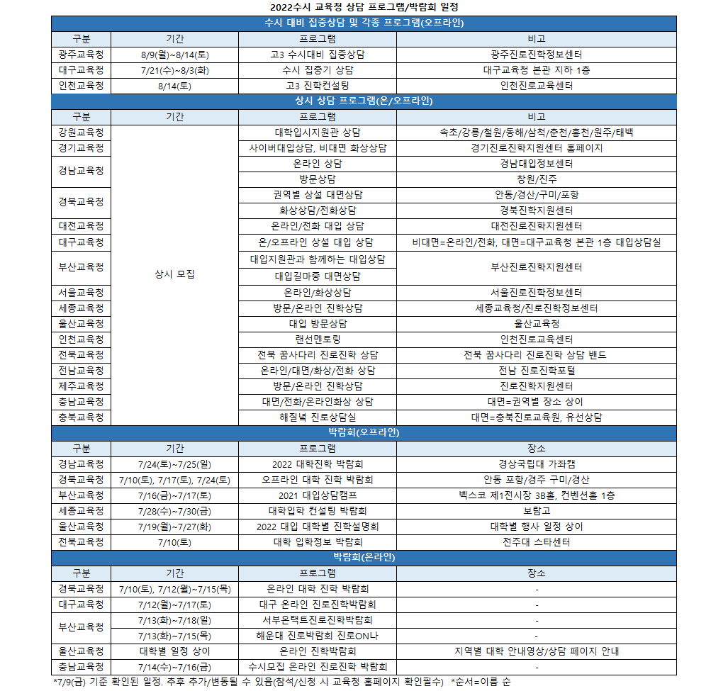 입시박람회의 경우 박람회 내에서 대면 상담을 받을 수 있음은 물론, 각 대학의 입학사정관들이 제공하는 입시정보를 확인할 수 있어 고3 수험생에게 무엇보다 중요한 행사로 꼽힌다. 오프라인 박람회가 확정된 6개 교육청 중 전북은 10일 하루동안 박람회를 진행하며, 나머지 4개교육청은 이틀 이상으로 일정을 나눠 운영한다. 다만 제한된 기간 동안 많은 인원이 참여하는 만큼 많은 대학에 참여하기 힘든 부분도 있고, 대학에서 제공하는 상담 시간에도 제한이 있다는 점을 고려해야 한다. 최근 코로나19의 확산세가 지속됨에 따라 온라인 진행으로 변경될 가능성도 배제할 수 없으므로 교육청별 공지 등을 수시로 확인해 볼 필요가 있다.