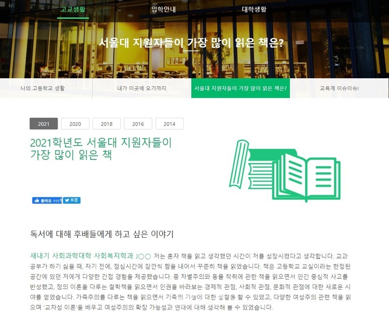 서울대는 2022학년 학생부종합전형 안내서를 통해 ‘예비 서울대 학생이라면 독서는 기본’이라고 설명한다. 독서는 모든 공부의 기초가 되며, 대학생활의 기본 소양이라는 설명이다. 어떤 책을 읽어야 할지는 자유롭게 선택하면 된다. 더 알고 싶은 분야의 전문서적을 찾아 읽을 수도 있고, 단순 호기심으로 책을 집어들 수도 있다. 책을 읽다가 생긴 궁금증으로 또 다른 책을 선택하기도 한다.