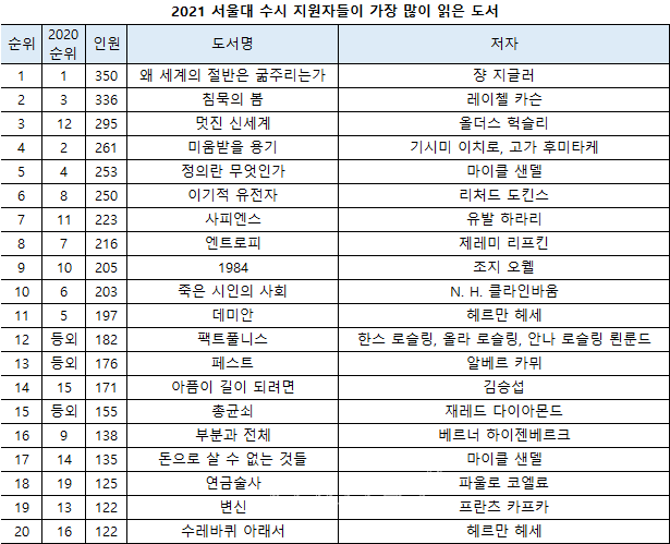 2021학년 수시 지원자들이 가장 많이 읽은 도서는 쟝 지글러의 ‘왜 세계의 절반은 굶주리는가’다. 2014학년~2016학년 1위도서에서 2017학년~2019학년까지 2위도서였다가 2020학년 다시 1위도서 자리를 차지한 이후 2년연속 1위 자리를 지켰다.