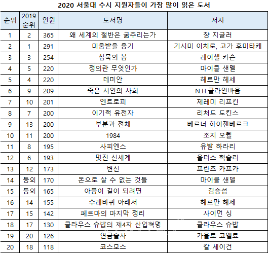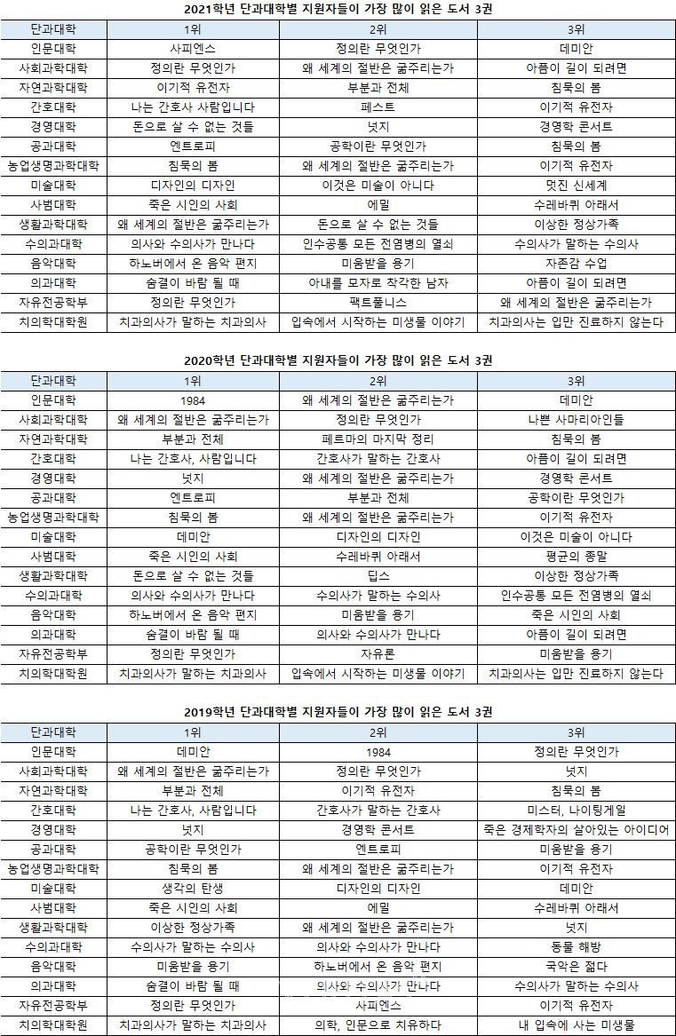 단과대학별 지원자들이 가장 많이 읽은 도서 톱3도 공개했다. 인문대학(사피엔스,정의란 무엇인가,데미안) 사회과학대학(정의란 무엇인가,왜 세계의 절반은 굶주리는가,아픔이 길이 되려면) 자연과학대학(이기적 유전자,부분과 전체,침묵의 봄) 간호대학(나는 간호사 사람입니다,페스트,이기적 유전자) 경영대학(돈으로 살 수 없는 것들,넛지,경영학 콘서트) 공과대학(엔트로피,공학이란 무엇인가,침묵의 봄) 농업생명과학대학(침묵의 봄,왜 세계의 절반은 굶주리는가,이기적 유전자) 미술대학(디자인의 디자인,이것은 미술이 아니다,멋진 신세계) 사범대학(죽은 시인의 사회,에밀,수레바퀴 아래서) 생활과학대학(왜 세계의 절반은 굶주리는가,돈으로 살 수 없는 것들,이상한 정상가족) 수의과대학(의사와 수의사가 만나다,인수공통 모든 전염병의 열쇠,수의사가 말하는 수의사) 음악대학(하노버에서 온 음악 편지,미움받을 용기,자존감 수업) 의과대학(숨결이 바람 될 때,아내를 모자로 착각한 남자,아픔이 길이 되려면) 자유전공학부(정의란 무엇인가,팩트풀니스,왜 세계의 절반은 굶주리는가) 치의학대학원(치과의사가 말하는 치과의사,입속에서 시작하는 미생물 이야기,치과의사는 입만 진료하지 않는다)이다.