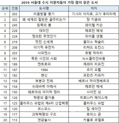 '침묵의 봄' '멋진 신세계' 톱3..단과대별 톱3도 공개