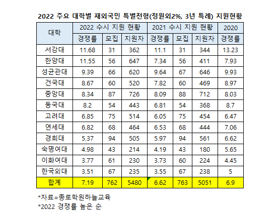 [베리타스알파=유다원 기자] 서울 주요 12개대(건국대 경희대 고려대 동국대 서강대 성균관대 숙명여대 연세대 이화여대 중앙대 한국외대 한양대)의 2022재외국민 정원외 2%, 중고교 과정 해외이수자 전형(3년 특례) 수시 원서접수를 마감한 결과, 평균 경쟁률이 7.19대1로 전년대비 상승한 것으로 나타났다. 종로학원하늘교육이 5일부터 9일까지 실시한 주요대학 원서접수 현황을 분석한 결과, 전년 같은 기준의 6.62대1보다 상승했다. 재외국민 정원외 2% 전형은 2019학년 7대1, 2020학년 7.43대1, 2021학년 6.62대1, 2022학년 7.19대1의 경쟁률을 보이고 있다.