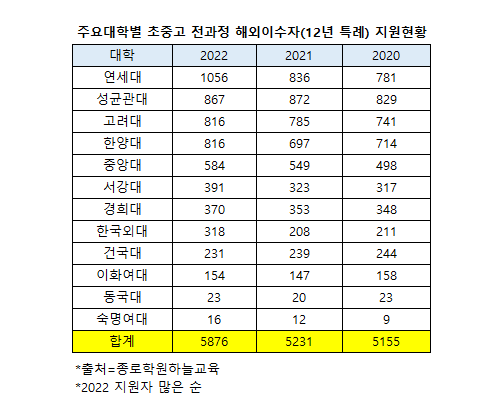 2022 재외국민 전형 중 모집인원의 제한이 없는 초중고 전 교육과정 해외이수자(12년 특례) 전형의은 12개대 기준 총 5876명이 지원한 것으로 나타났다. 전년 같은 기준의 5231명보다 645명 증가했다. 대학별 모집인원은 연세대(1056명) 성균관대(867명) 고려대(816명) 한양대(816명) 중앙대(584명) 서강대(391명) 경희대(370명) 한국외대(318명) 건국대(231명) 이화여대(154명) 동국대(23명) 숙명여대(16명) 순으로 많았다.