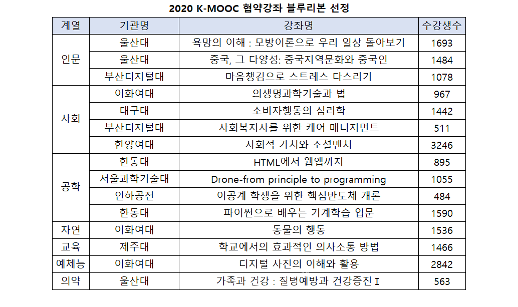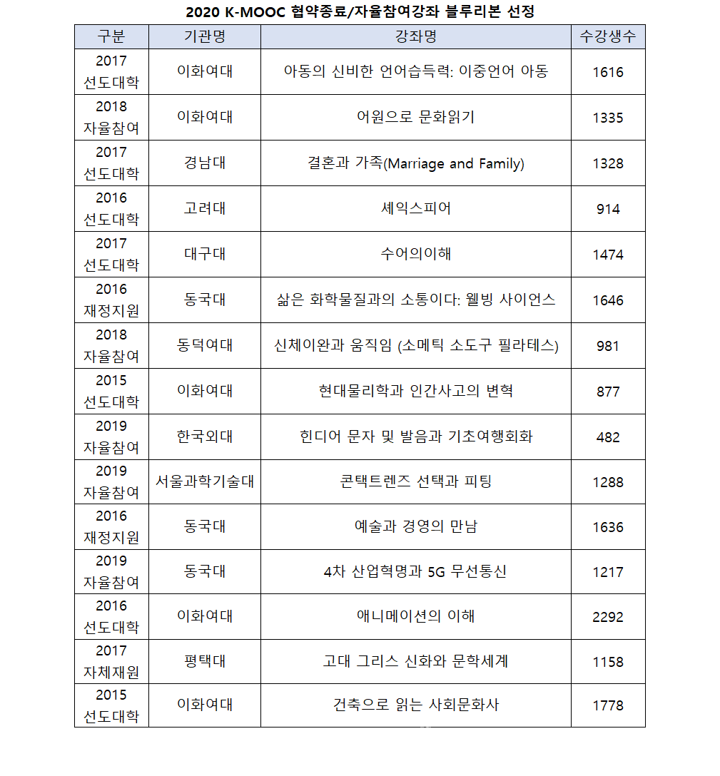 2020년 케이무크 우수강좌를 뜻하는 블루리본 강좌는 총 15개대 30개 강좌가 선정됐다. 케이무크 협약이 이뤄지는 강좌 15개, 협약이 종료됐거나 자율참여가 이뤄지는 강좌 15개의 선발이 이뤄졌다.