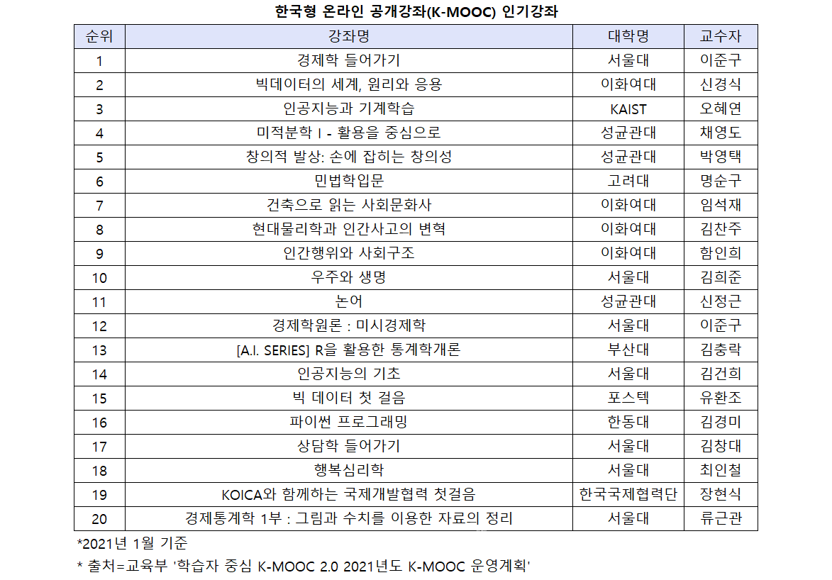 교육부는 지난 1월 발표한 ‘학습자 중심 K-MOOC 2.0 2021년도 K-MOOC 운영계획’을 통해 케이무크 인기강좌 톱20을 공개했다. 1위는 서울대 이준구 교수의 ‘경제학 들어가기’로 1월 기준 3만3852명이 강좌를 신청했다. 해당 강좌는 케이무크 시범운영 평가가 공개된 2016년부터 줄곧 1위를 차지하고 있다. 이어 이화여대 신경식 교수의 ‘빅데이터의 세계, 원리와 응용’이 신청자 1만8988명으로 2위, KAIST 오혜연 교수의 ‘인공지능과 기계학습’이 신청자 1만7540명으로 3위에 올랐다.