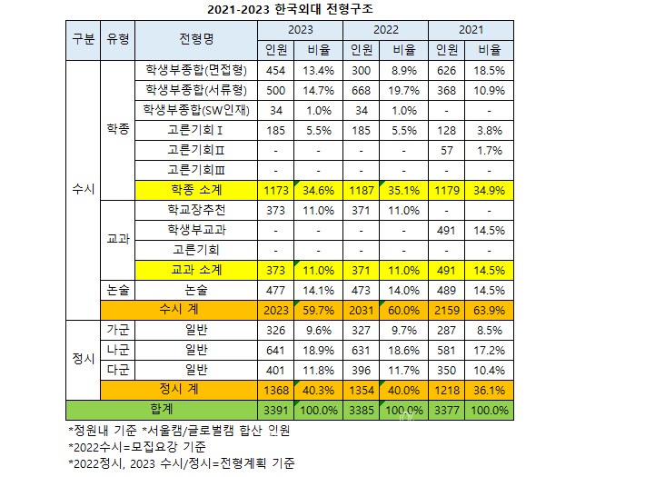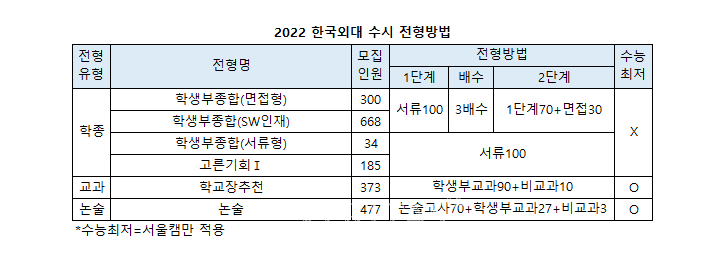 한국외대는 2022대입에서 정원내 기준 수시2031명(60%) 정시1354명(40%)으로 총3385명의 신입생을 선발한다. 교육부의 정시 확대 기조에 따라 정시 모집인원이 2021학년 1218명(36.1%)에서 1354명(40%)으로 136명(3.9%) 확대됐다. 수시 전형별 모집인원은 학교장추천371명(11%) 서류형668명(19.7%) 면접형300명(8.9%) SW인재34명(1%) 고른기회185명(5.5%) 논술473명(14%)이다. 지난해 학종 면접형으로 626명, 서류형으로 368명을 모집했던 것과 비교해 면접형 모집인원이 대폭 줄고 서류형 모집인원이 대폭 확대됐다. 2023학년에는 다시 면접형 인원이 증가하고 서류형 인원이 축소되는 양상을 나타낼 전망이다. 한국외대는 서울캠과 글로벌캠을 통합한 통합형 캠퍼스로 운영되고 있다.