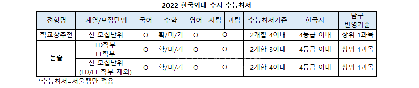 논술전형을 통해서는 2022수시에 전년 489명보다 16명 줄어든 473명의 신입생을 선발한다. 논술전형은 지난해부터 축소세를 보이고 있지만, 외대는 올해 자연계 논술모집을 신설해 타대학에 비해 논술전형 인원 감소폭이 비교적 적다.