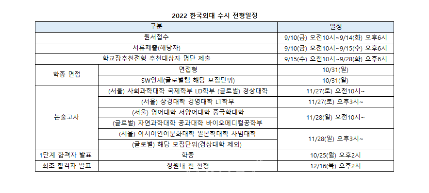 한국외대 2022수시 원서접수 기간은 9월10일 오전10시부터 14일 오후6시까지다. 서류제출은 9월10일부터 15일까지 가능하다. 학종 면접은 면접형과 SW인재 모두 10월31일 진행된다. 1단계 합격자는 10월25일 발표되며, 최초 합격자 발표는 수시 전 전형에서 12월16일로 예정돼 있다.