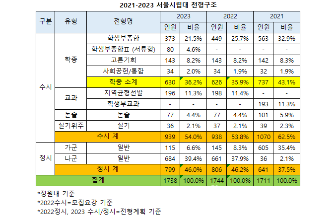 시립대는 2022대입에서 정원내 기준 수시938명(53.8%), 정시806명(46.2%)으로 총1744명의 신입생을 선발한다. 정시확대 기조에 따라 정시 모집인원이 2021학년 641명(37.5%)에서 2022학년 806명(46.2%)으로 165명(8.7%) 확대됐다. 수시 전형별 모집인원은 지역균형선발198명(11.4%) 학생부종합449명(25.7%) 고른기회143명(8.2%) 사회공헌/통합34명(1.9%) 논술77명(4.4%) 실기위주37명(2.1%)이다. 2023학년 역시 수시(54%)가 축소되고 정시(46%)가 강화되는 흐름을 이어갈 전망이다.