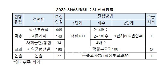 시립대 대표학종인 학생부종합은 2022수시에서 449명의 신입생을 선발한다. 지난해 563명을 모집했던 것과 비교해 114명 큰폭 감소했다.