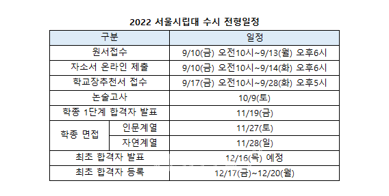 서울시립대 2022수시 원서접수는 9월10일 오전10시부터 13일 오후6시까지 나흘간 진행된다. 자소서 온라인 제출은 14일 오후6시까지다. 학교장추천서는 9월17일부터 28일까지 진행된다.