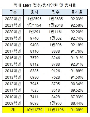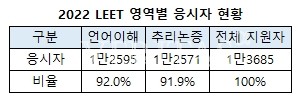 [베리타스알파=강태연 기자] 2022 LEET 채점 결과가 공개되면서 2022로스쿨 입시가 본격적으로 개막한다. 법학전문대학원협의회(로스쿨협의회)는 7월25일 실시한 2022 법학적성시험(LEET) 채점결과를 18일 공개했다. 지난해 줄어드는 법학계열 응사자수를 넘어선 사회계열이 올해는 계열 중 최대비율을 기록했다. 사회계열 응시자가 최대비중을 기록한 것은 LEET 시행 이후 처음이다. 사회계열 응시자는 전년 20.1%(2245명)에서 올해 22.4%(2824명)로 증가했다. 법학계열 응시자 감소는 로스쿨 보유대학의 법대폐지로 인해 법대출신이 줄어든 영향이다. 반면 다른 계열에서는 취업난이 장기화되면서 대학 졸업자, 졸업예정자들은 전문직인 법조인을 선호하는 경향이 상승했다. 올해 22세 이하(3.3%), 23세~25세(32.1%) 응시자가 전년대비 늘어난 모습도 눈에 띈다. 전년에는 26~28세가 32.3%의 비중으로 가장 컸지만 올해 23~25세 비율이 가장 컸다. 비교적 이른 시기부터 로스쿨 진학을 위한 응시비율이 늘어난 셈이다. 늘어나는 응시인원을 통해서도 인기를 실감할 수 있다. LEET 최근 응시인원은 4년연속 역대 최다를 기록하고 있다. 올해 지원자 1만3685명 가운데 언어이해영역은 1만2595명(92.0%), 추리논증영역은 1만2571명(91.9%)이 응시했다.
