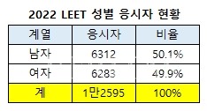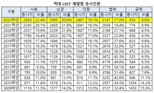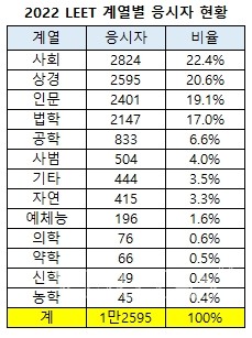 올해 응시자들은 사회계열이 가장 많았다. 2020,2021학년에는 상경계열이 법학계열을 제치고 응시자수가 가장 많았으나, 올해 사회계열이 579명이나 늘어나면서 응시비율은 22.4%로 최대비중을 기록했다. 법학계열은 올해 인문계열에도 밀려 네 번째를 기록했다. 사회계열 다음으로는 상경계열(2595명)(20.6%) 인문계열(2401명)(19.1%) 법학계열(2147명)(17%) 공학계열(833명)(6.6%) 사범계열(504명)(4%) 기타계열(444명)(3.5%) 자연계열(415명)(3.3%) 예체능계열(196명)(1.6%) 의학계열(76명)(0.6%) 약학계열(66명)(0.5%) 신학계열(49명)(0.4%) 농학계열(45명)(0.4%) 순이다.