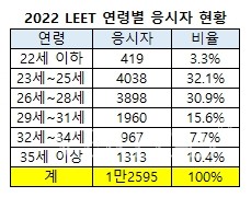 연령별로는 23세이상 25세이하가 4038명(32.1%)으로 가장 많았다. 전년에는 26세이상 28세이하 응시자가 가장 많았던 것에 비교해 비교적 연령층이 내려간 특징이다. 특히 22세이하 역시 전년 2%에서 올해 3.3%로 비율이 증가해, 매년 악화되고 있는 취업난의 영향으로 일찍부터 로스쿨을 준비하는 인원이 늘어난 것으로 분석된다. 23세이상 25세이하 32.1%에 이어 26세~28세3898명(30.9%) 29세~31세1960명(15.6%) 35세이상1313명(10.4%) 22세이하419명(3.3%) 32세~34세967명(7.7%) 순이다.