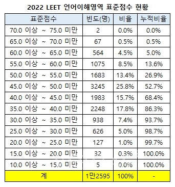 언어이해영역 표준점수는 10이상 75미만 구간에 분포했고, 가장 많은 응시자가 분포한 구간은 45이상 50미만으로 3245명(25.8%)이 몰려있었다. 지난해 표준점수는 10이상 80미만 구간에 분포한 반면 올해 표준점수 구간이 하락한 특징이 있다.