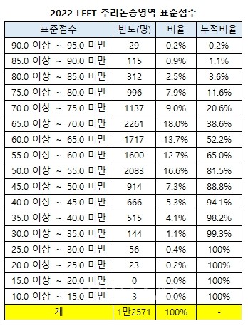LEET의 언어이해와 추리논증 영역의 성적은 표준점수와 표준점수에 해당하는 백분위로 소수 첫째자리까지 제공된다. 표준점수는 원점수 분포를 평균과 표준편차를 갖도록 변환해 응시자가 영역내 어느 위치에 있는지를 나타내는 점수다. 총점 및 원점수는 제공되지 않는다. 논술은 추후 수험생이 지원하는 로스쿨에서 채점해 자체적으로 활용방법을 결정한다.
