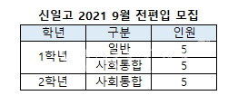 [베리타스알파=김하연 기자] 서울 광역단위 자사고인 신일고는 2021학년 9월 전편입생을 모집한다고 최근 밝혔다. 모집인원은 1학년 10명, 2학년 5명 모두 10명이다. 전형별로 구분하면 일반전형5명, 사회통합10명이다. 원서접수는 24일 오후3시부터 9월1일 오후12시까지 방문접수하며, 사회통합의 경우 상시 지원 가능하다. 공개추첨은 9월1일 오후3시 고교 소강당에서 진행한다.