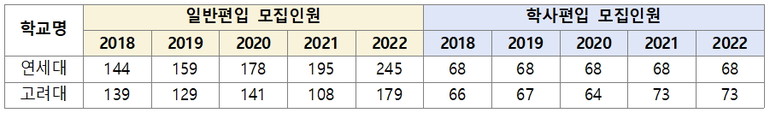 대학 편입시장에서 가장 선호도가 높은 고대 연대는 올해(2022학년) 565명을 선발하며 최근 5년동안 최대 규모의 문호를 선보였다. 2022학년 고대 연대 모집요강에 따르면 2개 대학이 올해 선발하는 편입 규모는 565명 (일반편입 424명, 학사편입 141명). 일반편입은 4년제 대학교 2년 수료(또는 전문학사 학위취득)자가, 학사편입은 4년제 대학 졸업자 응시한다. 2022연세대 일반편입은 245명으로 전년대비 26%가 증가했고, 고려대 일반편입은 179명으로 66%가 증가했다. 두 대학의 일반편입 증가율은 40%에 달한다.