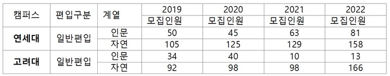 특히 연고대에서 자연계열의 일반편입 모집인원 증가가 두드러졌다. 2022 연세대는 158명(전년 129명)으로 전년대비 22.5%가 증가했고, 고려대는 166명(전년 98명)으로 전년대비 69.4%가 증가했다. 연고대 인문계열 모집규모는 2019학년 84명, 2020학년 85명, 2021학년 73명, 2022학년 94명인 반면, 자연계열 모집규모는 2019학년 197명에서 2022학년에는 324명으로 급증하는 추세다.