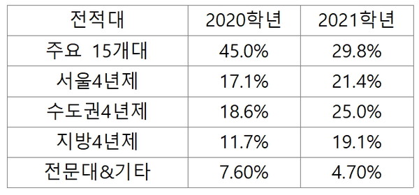 김영편입 진로진학연구소가 분석한 2020~2021학년도 연고대 합격자 전적대 비율에 따르면 주요15개 대학의 전적대 비율은 45.0%에서 29.8%로 감소한 반면 서울 4년제(17.1%→21.4%), 수도권 4년제(18.6%→25.0%), 지방 4년제(11.7%→19.1%)는 그 비율이 상승했다. 연고대 편입의 전적대 수준의 영향은 점차 완화되고 있음을 알 수 있다.