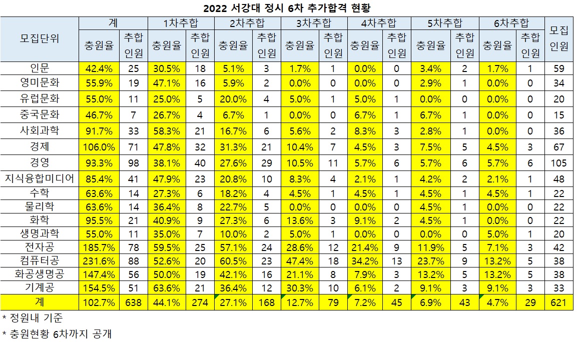 [베리타스알파=한정현 기자] 서강대가 2022정시에서 102.7%의 6차 누적 충원율을 기록했다. 모집인원 621명 중 638명이 추가합격했다. 전체 충원율이 한 바퀴를 넘긴 것이다. 차수별 충원인원은 1차 274명, 2차 168명, 3차 79명, 4차 45명, 5차 43명, 6차 29명이다.