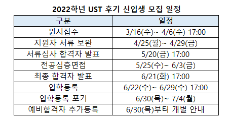 UST는 16일부터 내달 6일 오후5시까지 2022후기 신입생 모집 원서를 접수한다. 채용보장형 계약학과인 ‘I-CORE’는 내달 20일까지 접수한다. 모집 과정은 박사과정과 석박사통합/석사과정이다. 신입생은 일반전형, 내국인 특별전형, I-CORE(계약학과) 등을 통해 선발한다. 특별전형은 위탁생 북한이탈주민 외국인 재외국민 등이다. I-CORE(계약학과)는 채용조건형과 재교육형으로 나뉘어 산업체와 채용 연계 혹은 교육을 제공한다.