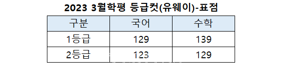 [베리타스알파=권수진 기자] 유웨이가 발표한 저녁8시30분 기준 2023 3월학평(2022년 3월 모의고사) 표준점수 기준 예상 1등급컷은 국어 129점, 수학 139점이다. 2등급컷은 국어 123점, 수학 129점으로 봤다.