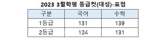 [베리타스알파=권수진 기자] 대성마이맥(대성)이 발표한 저녁8시45분 기준 2023 3월학평(2022년 3월 모의고사) 표준점수 기준 예상 1등급컷은 국어 131점, 수학 139점이다. 2등급컷은 국어 124점, 수학 131점으로 봤다.