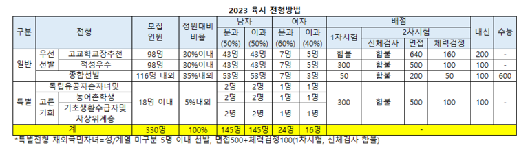 [베리타스알파=신현지 기자] 31일 육군사관학교(육사)가 입학처 홈페이지를 통해 ‘2023학년(제83기) 육군사관생도 선발시험 세부시행계획’을 공개했다. 이를 가시성 있는 책자 형태로 만든 것이 모집요강으로, 4월 내 공개 예정이다. 세부계획과 요강 사이의 변화는 없다. 전형방법과 일정은 지난해와 대부분 동일하다. 다만 내년 실시하는 2024학년 입시에서 남녀 계열별 모집인원과 체력검정방법 등의 변경을 추진하고 있다.