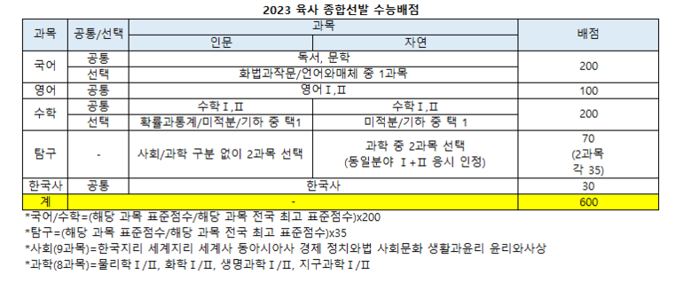 수능의 배점은 국어33.3%(200점)+영어16.7%(100점)+수학33.3.%(200점)+한국사5%+사/과탐11.7%(2개 과목 각 35점)으로 6개 영역 총 600점이다.