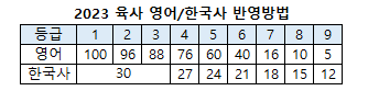절대평가인 영어와 한국사는 등급에 따라 일정 점수를 반영한다. 영어는 1등급 100점, 2등급 96점, 3등급 88점, 4등급 76점, 5등급 60점, 6등급 40점, 7등급 16점, 8등급 10점, 9등급 5점을 반영한다. 한국사는 3등급까지는 30점 만점을 부여한다. 이어 4등급 27점, 5등급 24점, 6등급 21점, 7등급 18점, 8등급 15점, 9등급 12점을 반영한다.