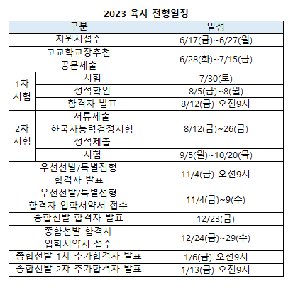 1차 시험은 4개 사관학교가 7월30일 동시 실시한다. 장소는 지역별 시험장이다. 성적은 8월5일부터 8일까지 원서대행업체에서 확인할 수 있다. 최초 합격자는 12일 오전9시 육사 입학처 홈페이지와 개별문자로 발표한다. 최초 합격자의 2차 시험 접수는 12일부터 17일 오후1시까지 한다. 대상자 일자 선택은 선착순 마감한다.