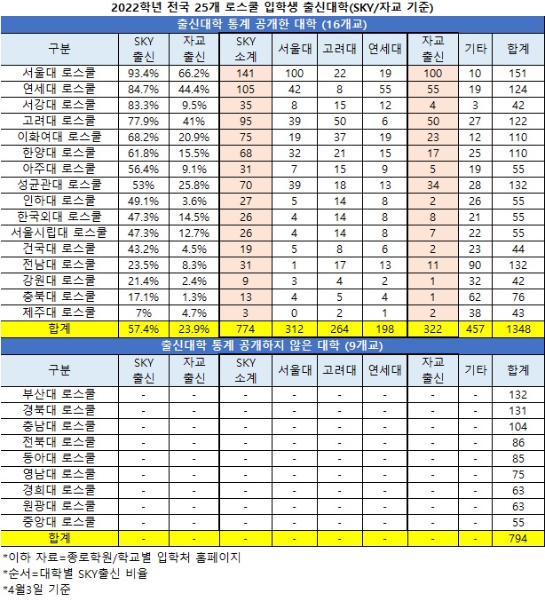 다만 2022학년 선발결과를 공개하지 않은 경북대 경희대 동아대 부산대 영남대 원광대 전북대 중대 충남대의 로스쿨 9개교가 있어 비율이 변동될 수 있다. 2021학년 신입생 자료를 참고하면 SKY 출신 비율은 중대 72.7%(40명/55명), 경희대 56.1%(37명/66명), 경북대 41.6%(52명/125명), 부산대 41.1%(53명/129명), 영남대 40%(28명/70명), 동아대 36.5%(31명/85명), 충남대 34.6%(36명/104명), 원광대 23.8%(15명/63명), 전북대 18.1%(15명/83명) 순이었다. 마찬가지로 서울 로스쿨의 SKY 출신 비율이 더 높다.