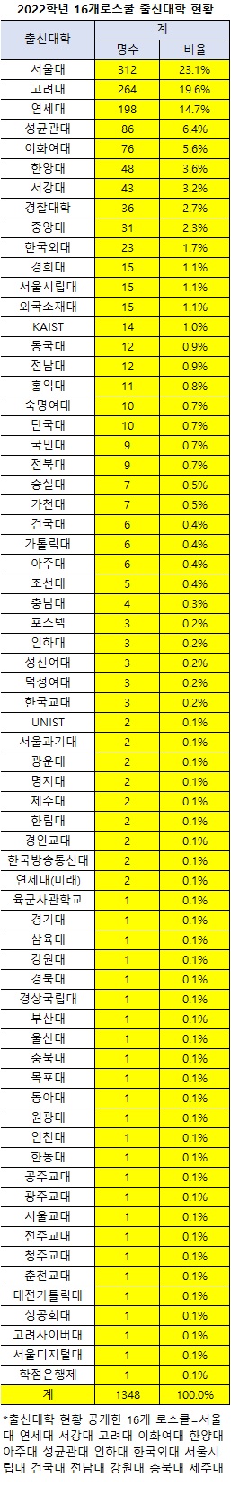 16개교 로스쿨 전체 신입생 1348명의 출신대학 현황을 살펴봐도 서울대가 23.1%(312명)로 1위를 기록했다. 고대 19.6%(264명), 연대 14.7%(198명), 성대 6.4%(86명), 이대 5.6%(76명)까지 톱5다. 이어 한대 3.6%(48명), 서강대 3.2%(43명), 경찰대학 2.7%(36명), 중대 2.3%(31명), 외대 1.7%(23명), 경희대 시립대 각 1.1%(15명), 외국 대학 1.1%(15명), KAIST 1%(14명)까지 1% 이상 비율이다. 이어 동대 전남대 각 0.9%(12명), 홍대 0.8%(11명), 단국대 숙대 각 0.7%(10명), 국민대 전북대 각 0.7%(9명), 가천대 숭실대 각 0.5%(7명), 가톨릭대 건대 아주대 각 0.4%(6명), 조선대 0.4%(5명), 충남대 0.3%(4명), 덕성여대 성신여대 인하대 포스텍 한국교대 각 0.2%(3명), 경인교대 광운대 명지대 서울과기대 연대(미래) 제주대 한림대 UNIST 한국방송통신대 각 0.1%(2명), 강원대 경기대 경북대 경상국립대 대전가톨릭대 동아대 목포대 부산대 삼육대 성공회대 울산대 원광대 육군사관학교 인천대 충북대 한동대 공주교대 광주교대 서울교대 전주교대 청주교대 춘천교대 고려사이버대 서울디지털대 학점은행제 각 0.1%(1명) 순이다.