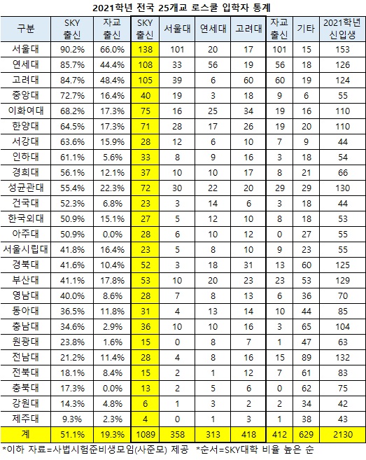 출신대학 현황을 공개한 16개 로스쿨의 선발결과를 살펴보면, 전체 1348명의 신입생 중 SKY 출신이 57.5%(775명)를 차지한다. SKY 출신이 가장 많은 곳은 서울대 로스쿨로, 무려 93.4%(141명)다. 통계를 세부적으로 살펴봐도 자교 출신 100명, 고대 22명, 연대 19명, KAIST 6명, 성대 2명, 서강대 경찰대학 각 1명으로 이공계특성화대와 특수대학을 제외하고 지방대 출신은 없다. 이어 연대가 84.7%(SKY 출신 105명/신입생 124명)로 자교 55명, 서울대 42명, 고대 성대 각 8명, 이대 경찰대학 각 2명, 가천대 서강대 시립대 포스텍 한대 KAIST 각 1명을 선발했다. 외국 대학 출신도 1명 있다. 서강대는 83.3%(35명/42명)로 자교 4명, 서울대 8명, 고대 15명, 연대 12명, 경희대 KAIST 각 1명을 선발했다. 외국 대학 출신도 1명 있다. 이공계특성화대, 특수대학, 외국 대학과 수도권의 가천대를 제외하면 톱3 모두 지방대 출신이 없다.