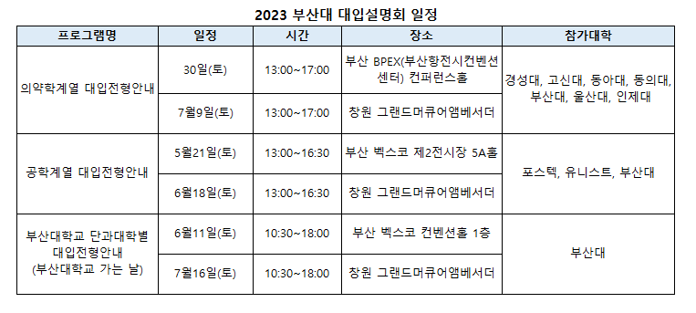 의약학계열과 공학계열 설명회는 인근 대학과 연합해 별도로 진행한다. 의약학계열은 경성대 고신대 동아대 동의대 부산대 울산대 인제대 등 부울경 7개교가 함께하며 공학계열은 포스텍 유니스트 부산대 등 3개교가 함께하는 특징이다. 의약학계열 설명회는 30일(토)과 7월9일(토) 오후1시부터 5시까지 두차례 진행한다. 장소는 1회차 부산 BPEX(부산항전시컨벤션센터) 컨퍼런스홀, 2회차 창원 그랜드머큐어앰버서더에서 진행한다. 공학계열 설명회는 내달 21일(토)과 6월18일(토) 오후 1시에서 4시30분까지 두차례 진행한다. 장소는 1회차 부산 벡스코 제2전시장 5A홀, 2회차 창원 그랜드머큐어앰버서더다. 접수는 의약학계열은 15일(금), 공학계열 22일(금) 오전10시부터 선착순 모집한다. 부산대 입학처 홈페이지 혹은 연합한 대학별 입학홈페이지에서 접수할 수 있다.