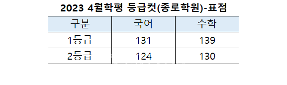 [베리타스알파=권수진 기자] 종로학원이 발표한 오후6시30분 기준 2023 4월학평(2022년 4월 모의고사) 표준점수 기준 예상 1등급컷은 국어 131점, 수학 139점이다. 2등급컷은 국어 124점, 수학 130점으로 봤다.