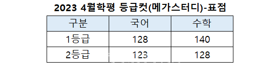 [베리타스알파=권수진 기자] 메가스터디가 발표한 오후6시53분 기준 2023 4월학평(2022년 4월 모의고사) 표준점수 기준 예상 1등급컷은 국어 128점, 수학 140점이다. 2등급컷은 국어 123점, 수학 128점으로 봤다.