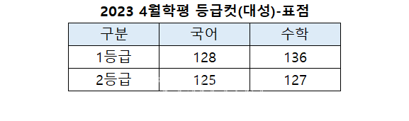 [베리타스알파=권수진 기자] 대성이 발표한 오후8시10분 기준 2023 4월학평(2022년 4월 모의고사) 표준점수 기준 예상 1등급컷은 국어 128점, 수학 136점이다. 2등급컷은 국어 125점, 수학 127점으로 봤다.