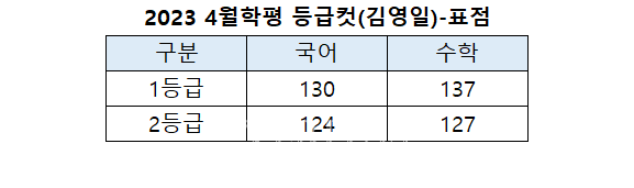 [베리타스알파=권수진 기자] 김영일교육컨설팅이 발표한 오후8시20분 기준 2023 4월학평(2022년 4월 모의고사) 표준점수 기준 예상 1등급컷은 국어 130점, 수학 137점이다. 2등급컷은 국어 124점, 수학 127점으로 봤다.