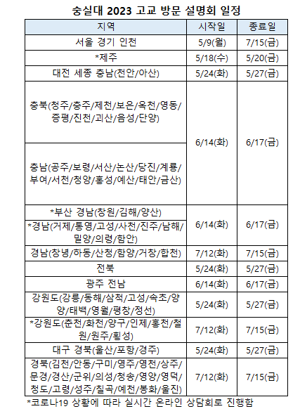 [베리타스알파=신현지 기자] 숭실대는 2023학년 대입을 앞두고 고교 방문 입시설명회인 ‘알기 쉬운 대입전형 상담회’를 진행한다고 14일 밝혔다. 설명회는 내달 9일(월)부터 7월15일(금)까지 진행한다. 지역별로 운영 일정이 상이하다. 상담은 오프라인 방문과 온라인(줌/메타버스)을 병행할 예정이다. 메타버스는 5월 말부터 운영한다. 서울 경기 인천 대전 세종 충남 충북 전북 광주 전남 대구 경북은 오프라인으로 진행하며 제주 부산 경남 강원도는 온라인으로 진행한다.