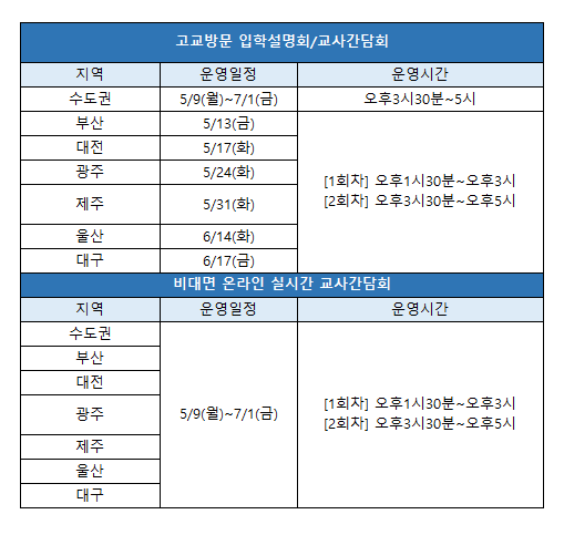 고교방문 입학상담회/교사간담회는 학생과 교사를 대상으로 한다. 내달 9일(월) 수도권을 시작으로 권역별로 진행한다. 비대면 온라인 실시간 교사간담회는 내달 9일(월)부터 7월1일(금)까지 진행한다. 신청은 22일(금) 오전 10시부터 선착순 마감한다. 입학처 홈페이지를 통해 접수할 수 있다. 두 방식 중 하나를 선택할 수 있으며 대면 프로그램과 비대면 프로그램을 중복해 신청할 수 없다.